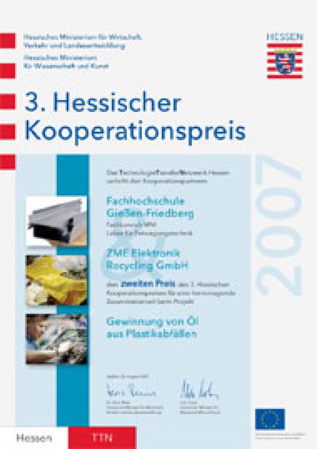 In Zusammenarbeit mit dem Labor für Entsorgungstechnik (Prof. Stadlbauer) der FH Gießen entwickelte ZME® ein neues Verfahren zum Recycling von Kunststoffen, das 2006 den 2. Preis des hessischen Kooperationspreises erzielte.